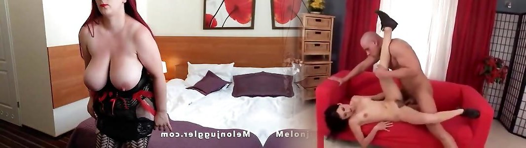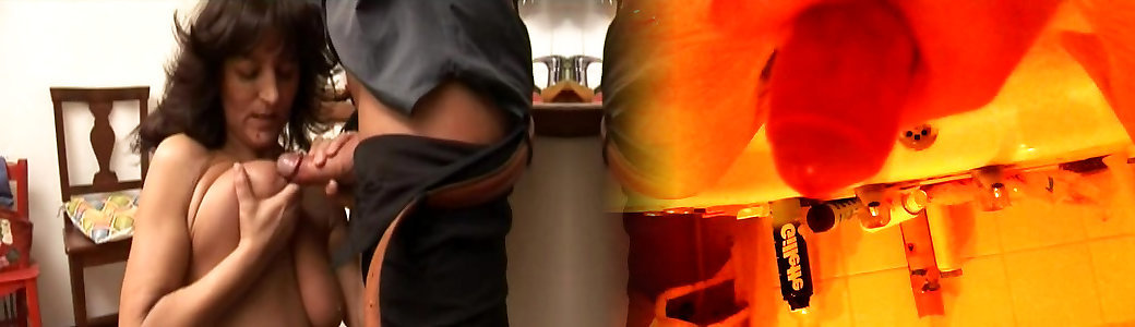 Youthfull boy gives an old doll with gigantic funbags some fun