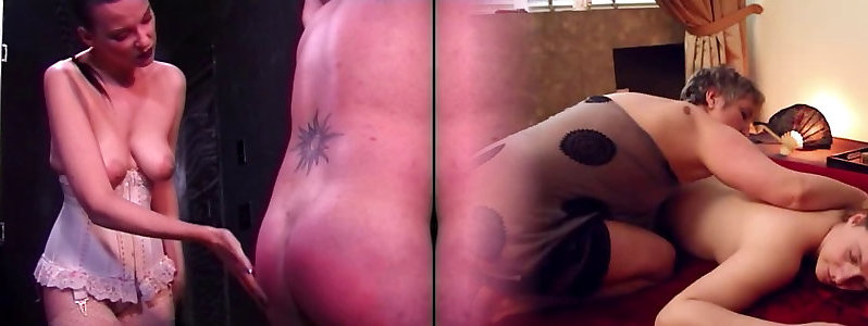 Dominatrix in milky harness paddles her marionette&039;s donk in her dungeon
