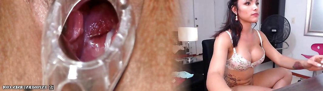 Ebony nurse Manuela checks her open puss with a mirror